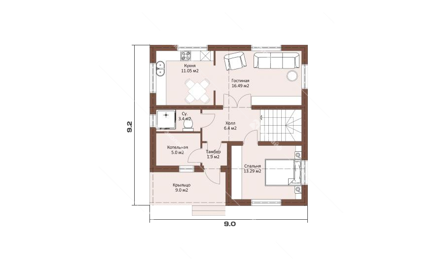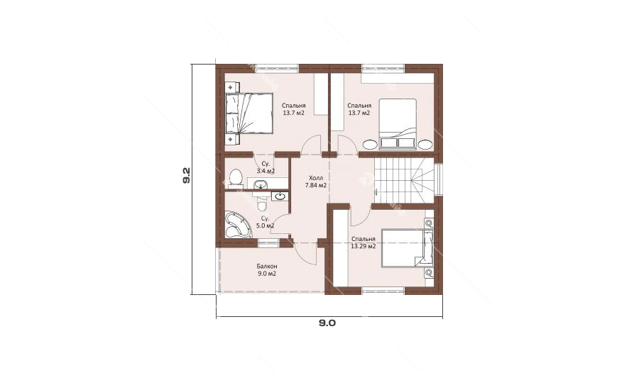 Готовый проект двухэтажного дома 9,0 на 9.2 метра, общей площадью 143 м2, из газобетона (пеноблоков) или теплой керамики.