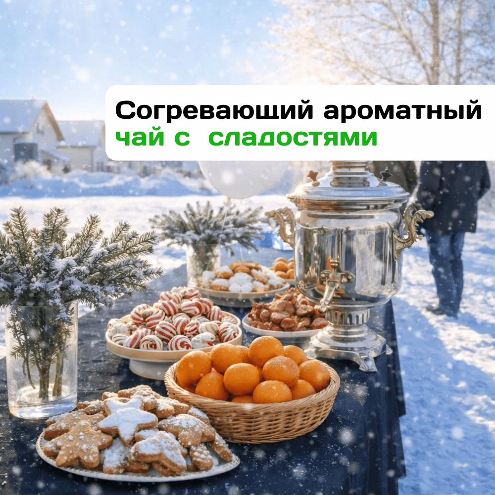 зимние забавы для детей и взрослых, угощения, ароматный горячий чай, подарки и множество приятных сюрпризов сделают этот день по-настоящему тёплым и запоминающимся.