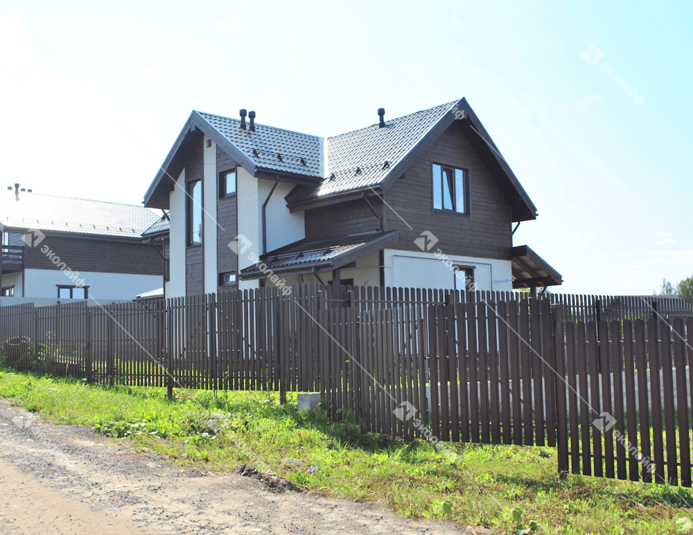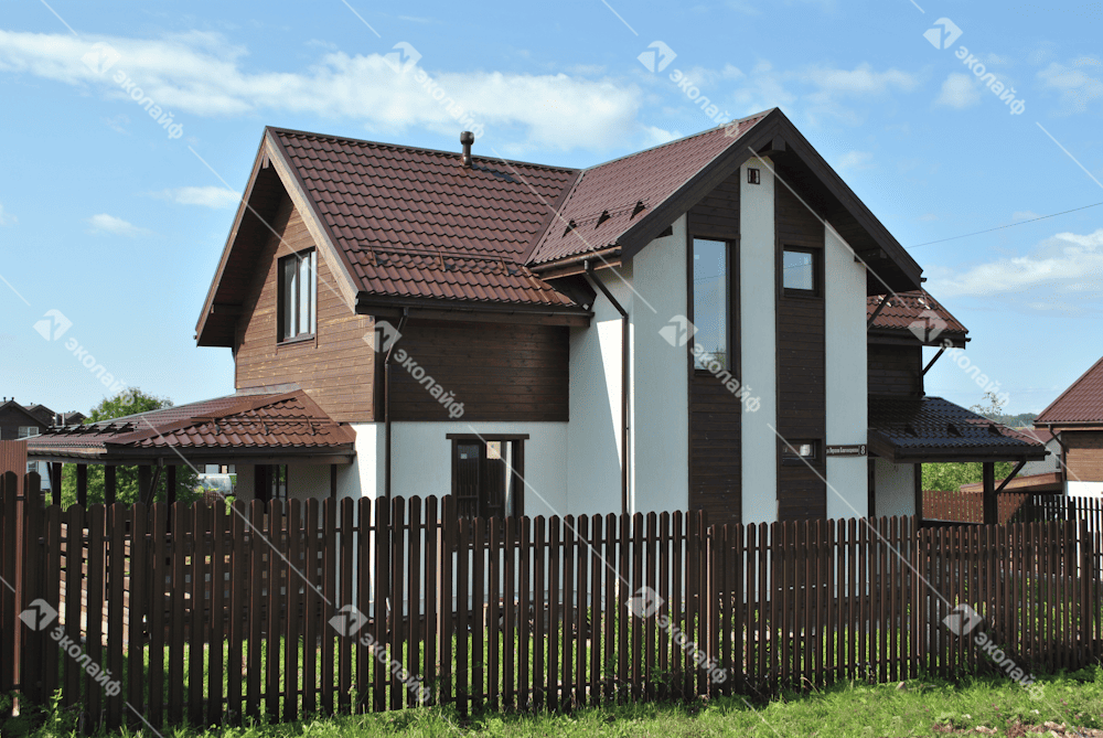 Для внешней отделки использована декоративная штукатурка Ceresit «Короед» в сочетании с экологичным планкеном из натурального дерева. Дом возведён на надёжном фундаменте — монолитная плита по грунту. Кровля выполнена из кликфальца, установлены качественные двухкамерные окна, обеспечивающие тепло и тишину в доме.