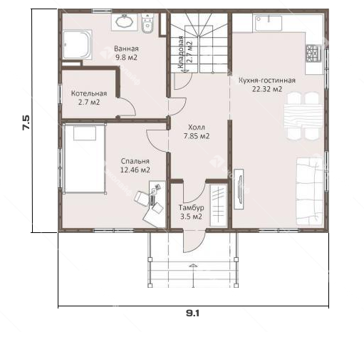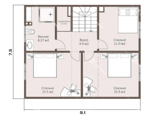 Готовый проект двухэтажного дома 9,1 на 7.5 метра, общей площадью 125 м2, из газобетона (пеноблоков) или теплой керамики.