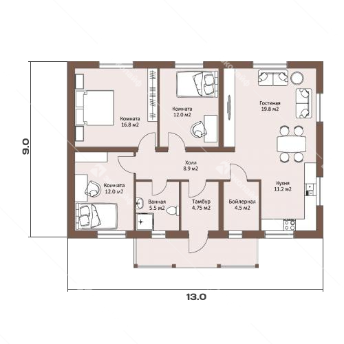 Проект одноэтажного дома 13 на 9 метров, общей площадью 103 м2, из теплой керамики или газобетона (пеноблоков)