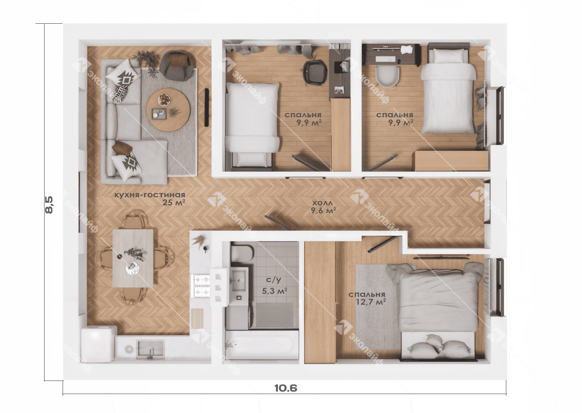 Готовый проект одноэтажного дома 10.6 на 8.5 метра, общей площадью 73 м2, из теплой керамики или газобетона (пеноблоков) от строительно компании Эколайф.