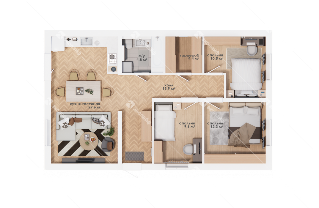 • 3 комнаты..........9,6 м2, 12,3 м2 и 10,5 м2